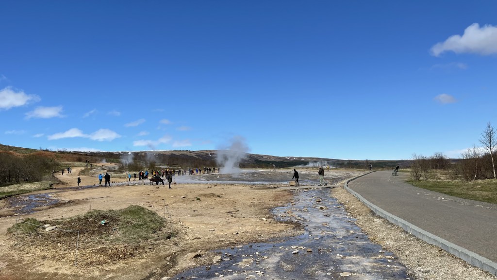 Powyższe zdjęcie wykonałem przed gejzerem. Liczba turystów w tym miejscu była dzisiaj tak duża, że dosłownie kończyły się miejsca na parkingu. Ludzie chodzili przy gejzerze, ale też wspinali się na pagórki wokół, żeby podziwiać całą okolicę. Zaskakujące!